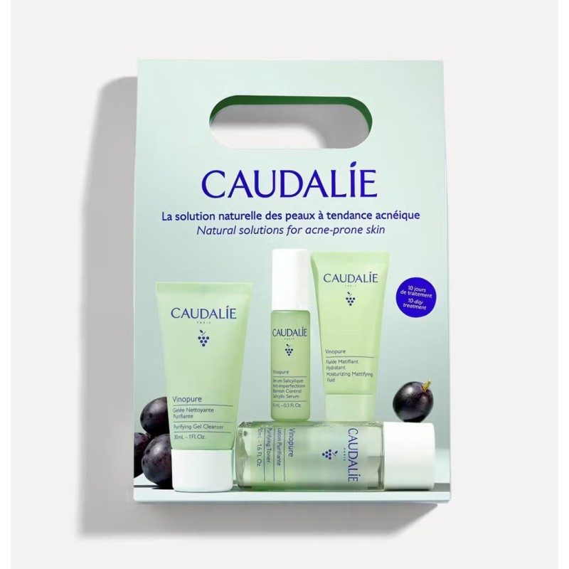 Este tratamiento de 15 días de la gama caudalie vinopure está diseñado para proporcionar una rutina completa de cuidado para pieles con exceso de sebo, poros dilatados, brillos y tendencia a granitos o imperfecciones. Incluye cuatro pasos esenciales: - limpiador purificante (gelatina limpiadora purificante con ácido salicílico natural) que limpia profundamente la piel sin resecarla, ayuda a minimizar los poros y reduce el exceso de sebo. - loción purificante / tónico (loción purificante con ácido salicílico, agua de uva bio y aceites esenciales) que refina la textura, reduce imperfecciones y ayuda a matificar la piel tras la limpieza. - sérum anti-imperfecciones (sérum ácido salicílico) para desincrustar poros, reducir granitos, afinar la textura de la piel y aportar luminosidad sin brillos. - fluido matificante hidratante (fluido matificante hidratante) que completa la rutina aportando hidratación adaptada, acabado mate con polvos de sílice, mejora de textura y control del sebo durante el día y la noche.