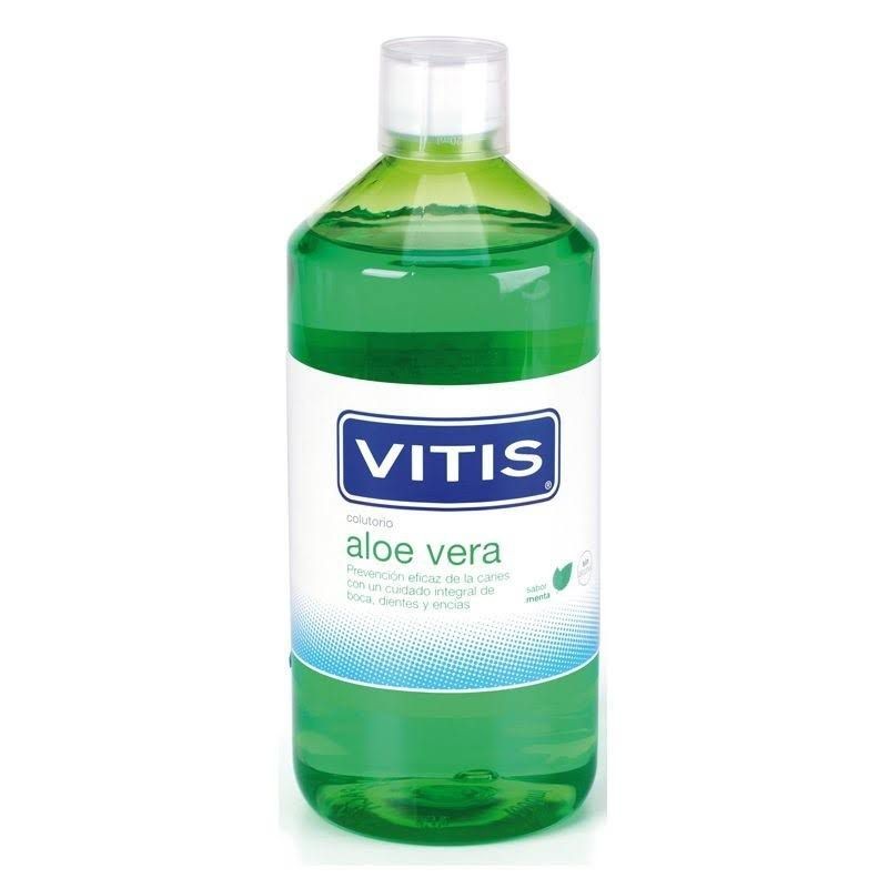 Vitis Aloe Vera Colutorio Sabor Menta es un enjuague bucal con efecto antiséptico que elimina el biofilm oral de la cavidad bucal, llegando a las zonas de difícil acceso, como las zonas posteriores. Su completa formulación contiene los principios activos necesarios para una higiene bucal óptima. Su uso diario proporciona cuidado integral de boca, dientes y encías dejando un agradable y refrescante sabor a menta.