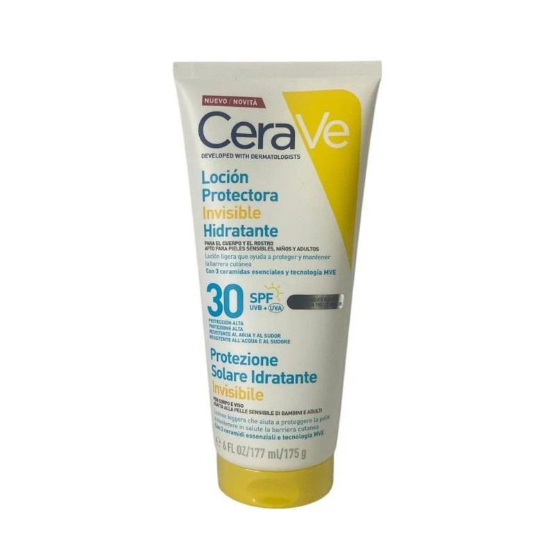 Cerave loción protectora invisible hidratante spf30 es un protector solar facial y corporal de protección alta spf 30 que ayuda a proteger la piel frente a los rayos uva y uvb. Su textura ligera se absorbe con rapidez y no deja residuos blancos. Está desarrollada con dermatólogos y formulada para respetar la barrera cutánea.